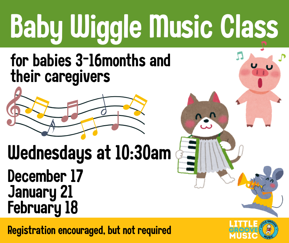 Music and Movement Programs December 11: Drop in program! No registration needed! December 17: Registration Encouraged January 10: Registration Encouraged