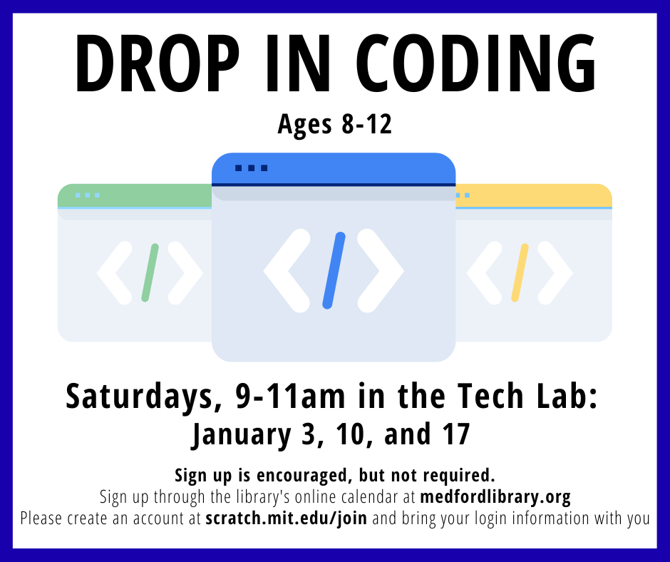 S.T.E.A.M. Programs December 29: Registration Required. December 29: Registration Required. December 30: Drop in! January 3: Sign up encouraged, but not requiredPlease create an account at scratch.mit.edu/join before class and bring your login information with you! January 5: Registration Required January 5: Registration Required. January 6: Registration Required. January 8: Drop in! January 13: Drop In! January 14: Registration Required. January 14: Registration Required January 15: Drop In January 20: Registration Required January 21: Registration Required. January 22: Registration Required January 26: Registration Required January 27: Registration Required February 7: Registration Required February 18: Registration Required February 23: Registration Required February 23: Registration Required February 26: Registration Required