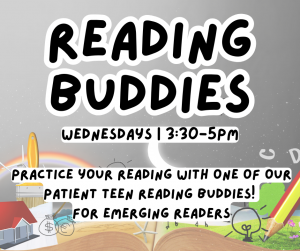 Reading Buddies is a weekly program that happens on Wednesdays from 3:30 to 5pm from October-May. During this time, emerging readers can “check out” one of our teen volunteer Reading Buddies for 30 minutes to practice their reading skills. Reading Buddies offer an encouraging ear and only jump in to help when asked by their reader. Registration is not required, but there may be a wait on afternoons when we are busy.