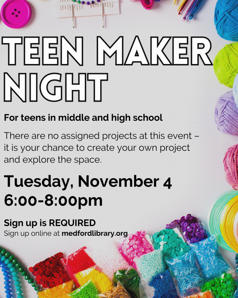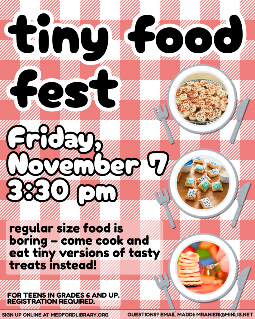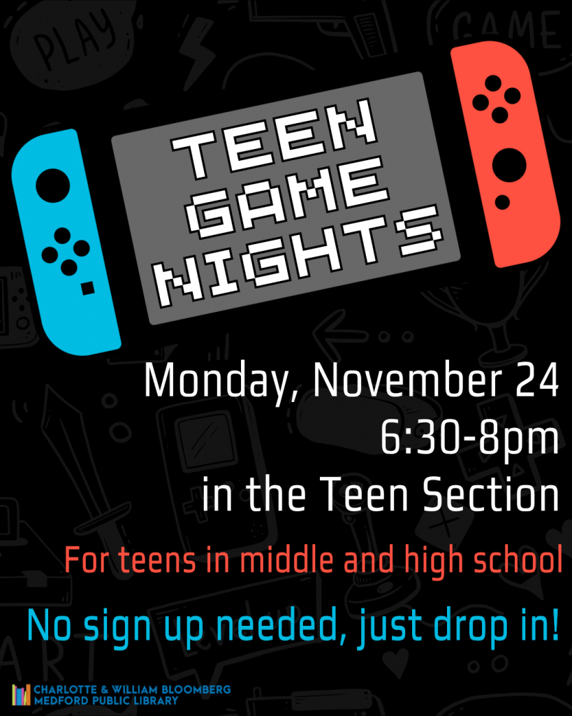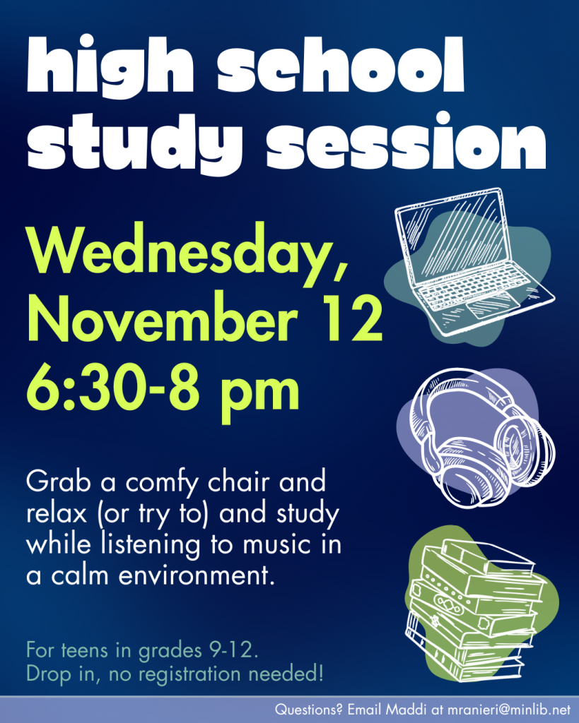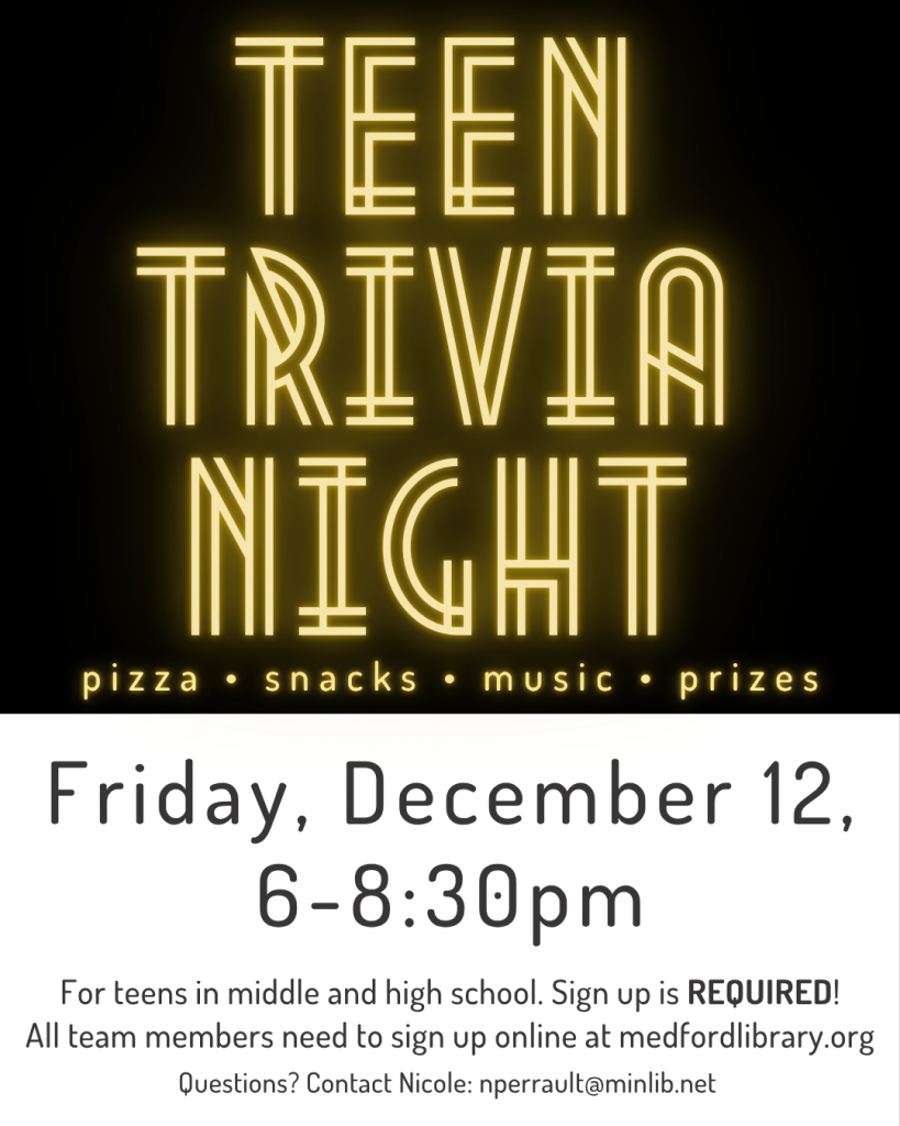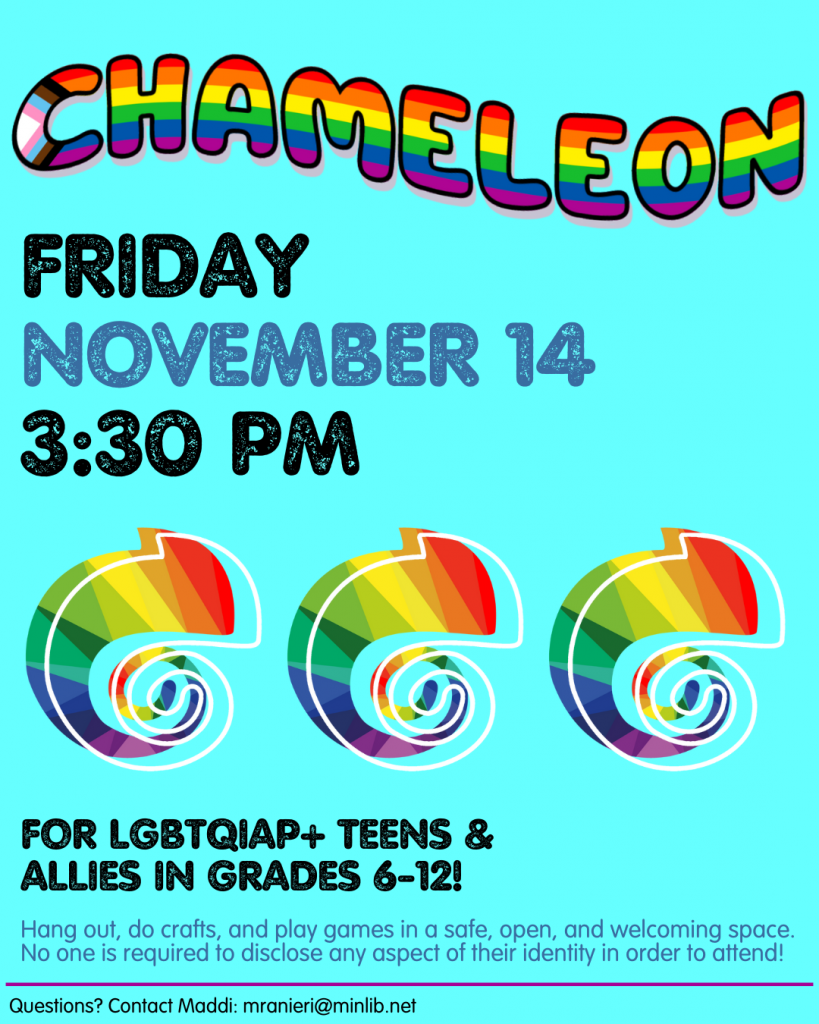Teen Events We have a new sign up system! Registering for a program does not guarantee that you are officially signed up. Once library staff reviews your registration, you will get an email confirmation or an email letting you know that you are on the waitlist. Special Events November 6: Sign up November 17: No sign up needed November 20: Sign up November 21: Sign up December 9: Sign up December 12: Sign up December 16: Sign up December 18: Sign up Art and Maker Events November 3: Sign up November 4: Sign up November 5: Sign up November 7: Sign up November 12: Sign up November 19: Sign up November 20: Sign up November 25: Sign up November 18: Sign up December 1: Sign up December 4: Sign up December 18: Sign up December 22: Sign up Book Clubs: November 12: Sign up November 13: Sign up encouraged, but not required 2025 Teen Library BingoSeptember 1-December 31 Chameleon November 14: No sign up needed! Gaming and Tech Events: November 24: No sign up needed! November 1: No sign up needed November 4: Sign up If you have any questions, please contact Nicole in the Teen Section: nperrault@minlib.net | 781-475-5735