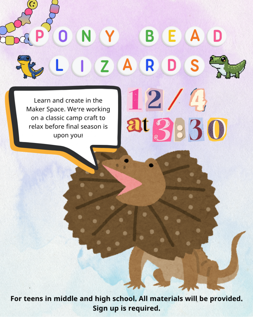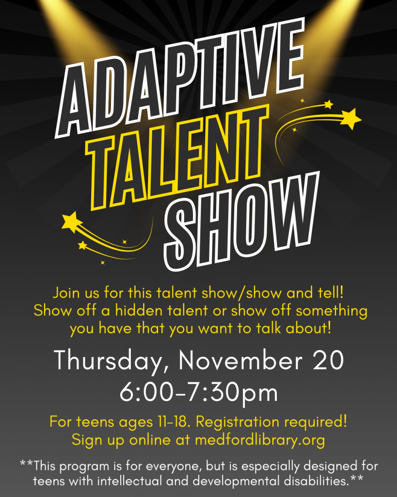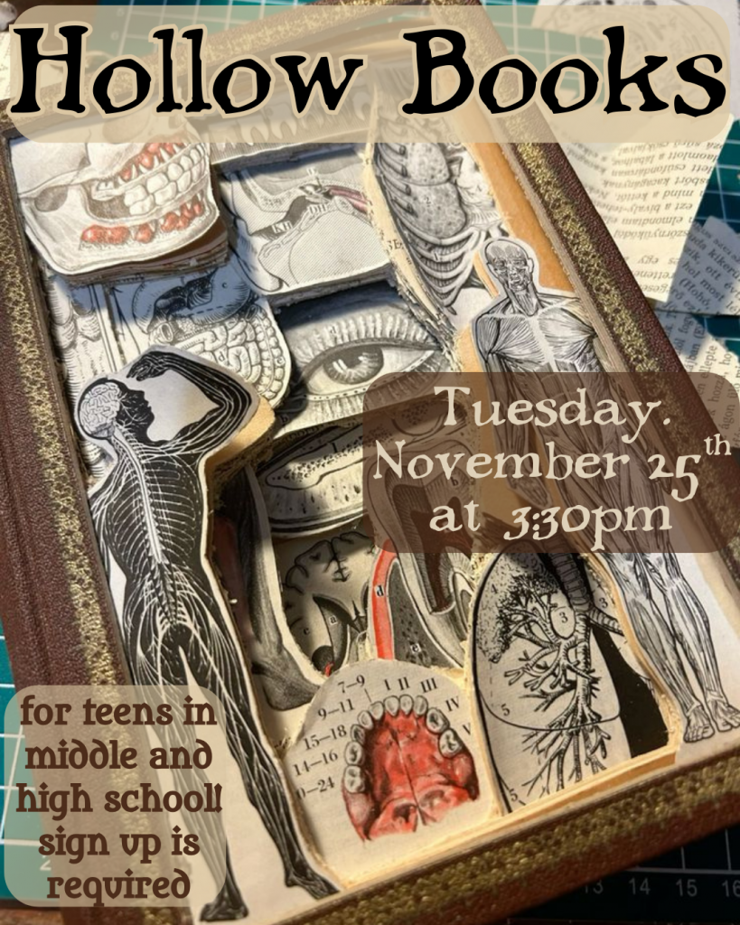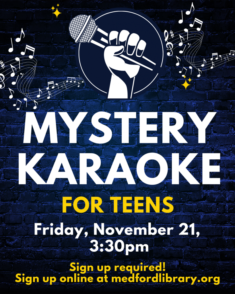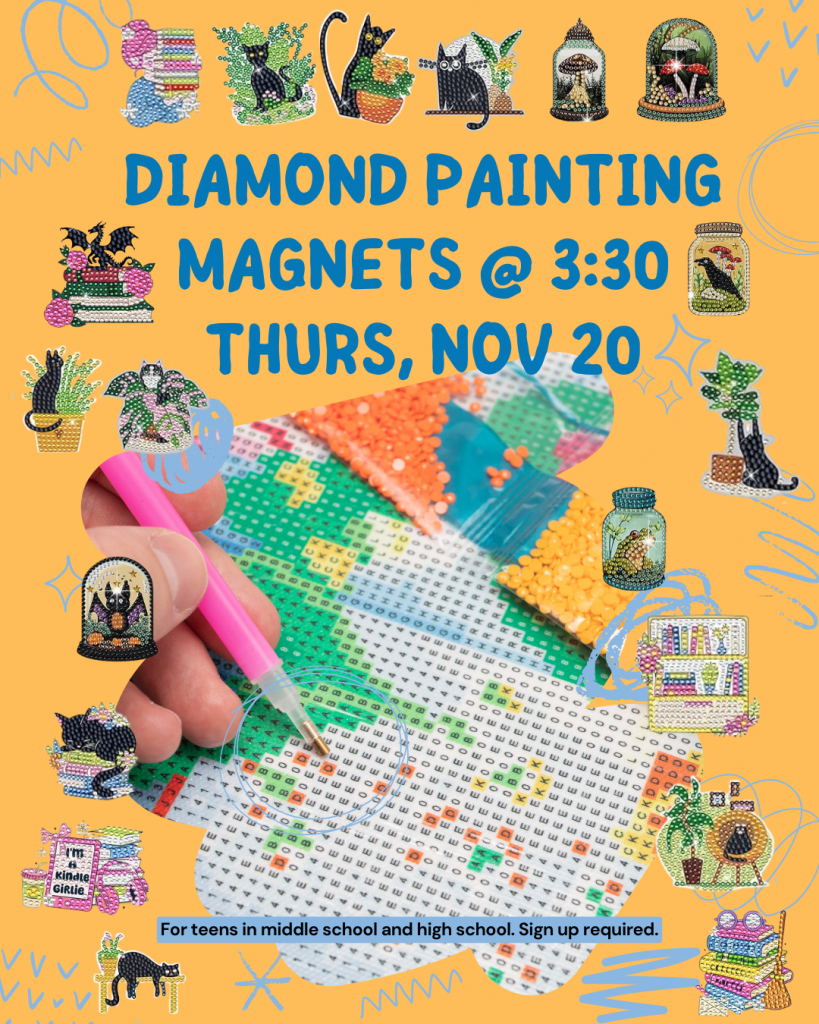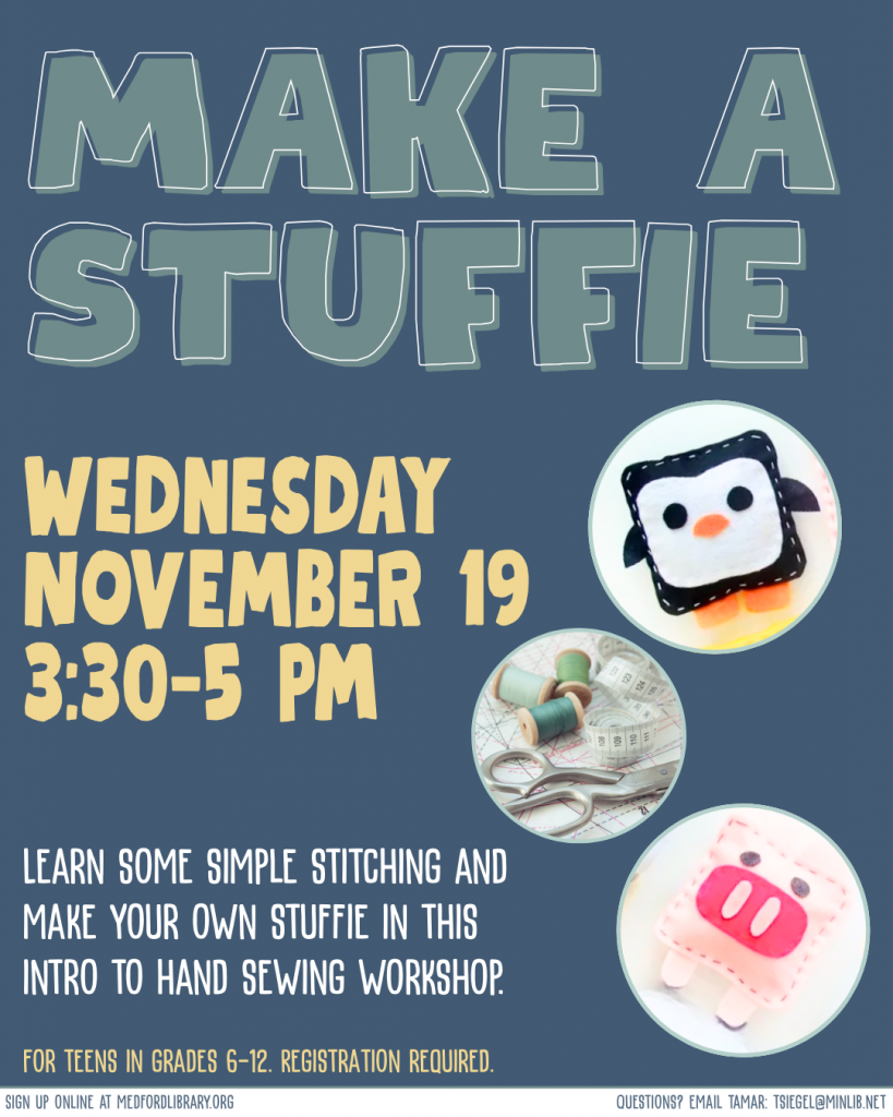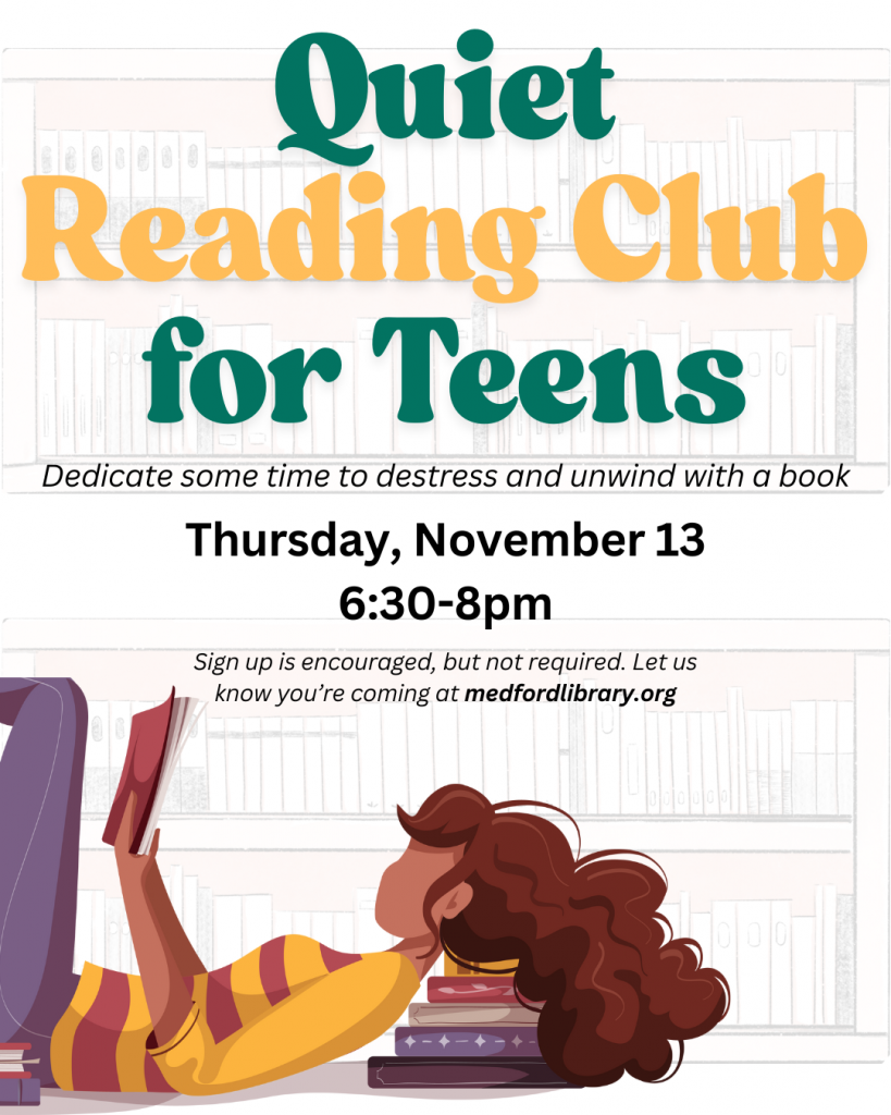 Teen Events We have a new sign up system! Registering for a program does not guarantee that you are officially signed up. Once library staff reviews your registration, you will get an email confirmation or an email letting you know that you are on the waitlist. Special Events November 6: Sign up November 17: No sign up needed November 20: Sign up November 21: Sign up December 9: Sign up December 12: Sign up December 16: Sign up December 18: Sign up Art and Maker Events November 3: Sign up November 4: Sign up November 5: Sign up November 7: Sign up November 12: Sign up November 19: Sign up November 20: Sign up November 25: Sign up November 18: Sign up December 1: Sign up December 4: Sign up December 18: Sign up December 22: Sign up Book Clubs: November 12: Sign up November 13: Sign up encouraged, but not required 2025 Teen Library BingoSeptember 1-December 31 Chameleon November 14: No sign up needed! Gaming and Tech Events: November 24: No sign up needed! November 1: No sign up needed November 4: Sign up If you have any questions, please contact Nicole in the Teen Section: nperrault@minlib.net | 781-475-5735