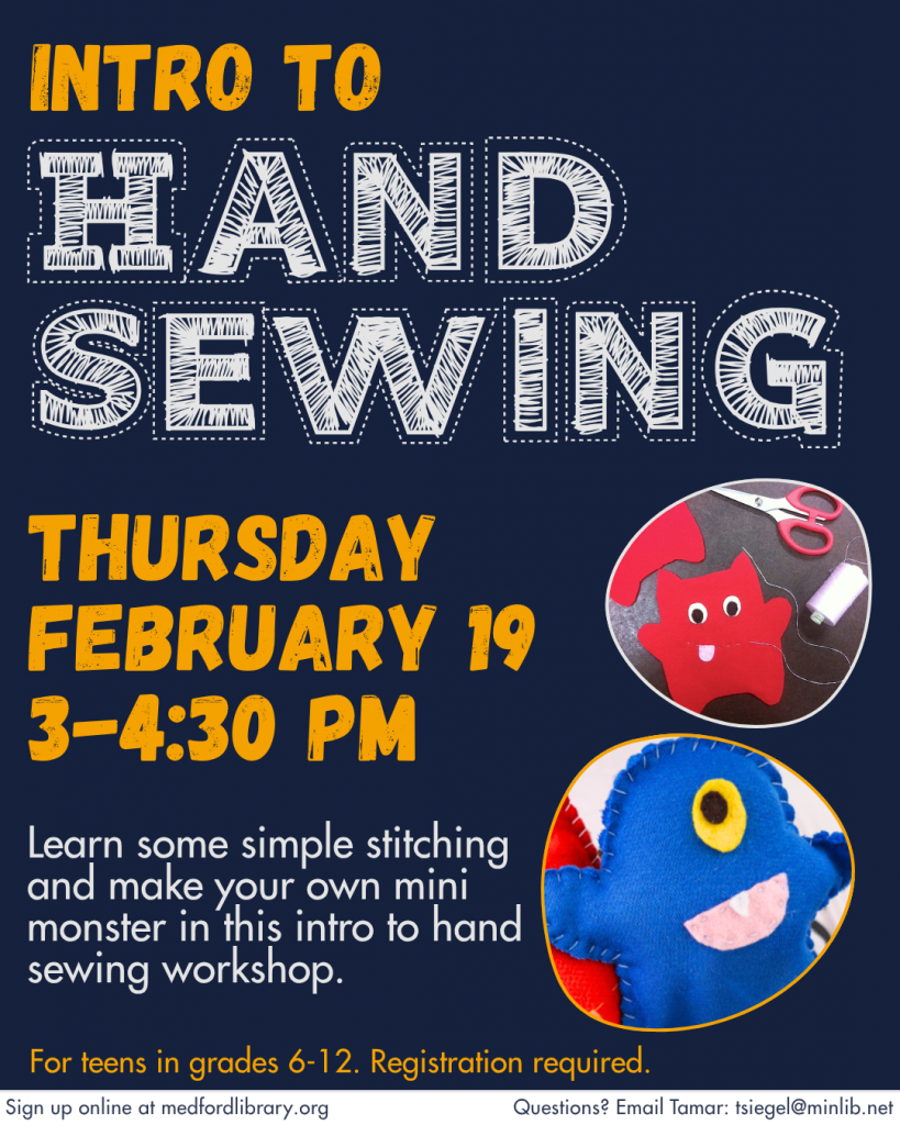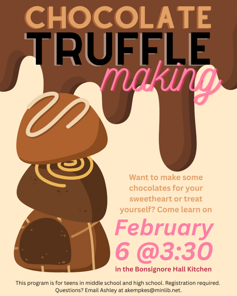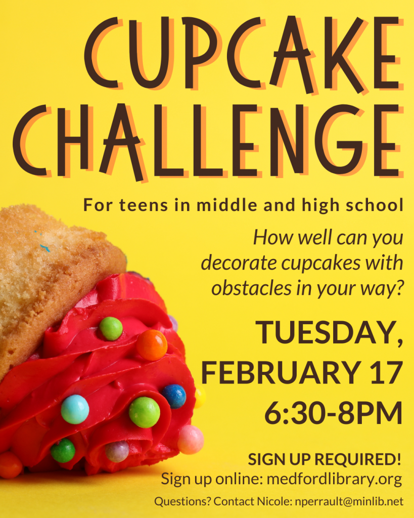 Teen Events We have a new sign up system! Registering for a program does not guarantee that you are officially signed up. Once library staff reviews your registration, you will get an email confirmation or an email letting you know that you are on the waitlist. Special Events December 30: No sign up needed January 2: Sign up January 21: No sign up needed February 6: Sign up February 14: No sign up needed February 17: Sign up February 18: Sign up February 20: Sign up Art and Maker Events January 5: Sign up January 6: Sign up January 12: No sign up needed January 13: Sign up January 14: Sign up January 20: Sign up January 15: Sign up January 22: Sign up January 28: Sign up January 29: Sign up February 2: Sign up February 5: Sign up February 9: Sign up February 18: Sign up February 9: Sign up February 18: Sign up Book Clubs: 2026 Teen Reading ChallengeJanuary 1- May 31 January 14: Sign up January 20: Sign Up January 27: Sign Up January 29: No sign up needed Chameleon January 9: No sign up needed! Gaming and Tech Events: January 26: No sign up needed! January 6: Sign up January 15: Sign Up If you have any questions, please contact Nicole in the Teen Section: nperrault@minlib.net | 781-475-5735
