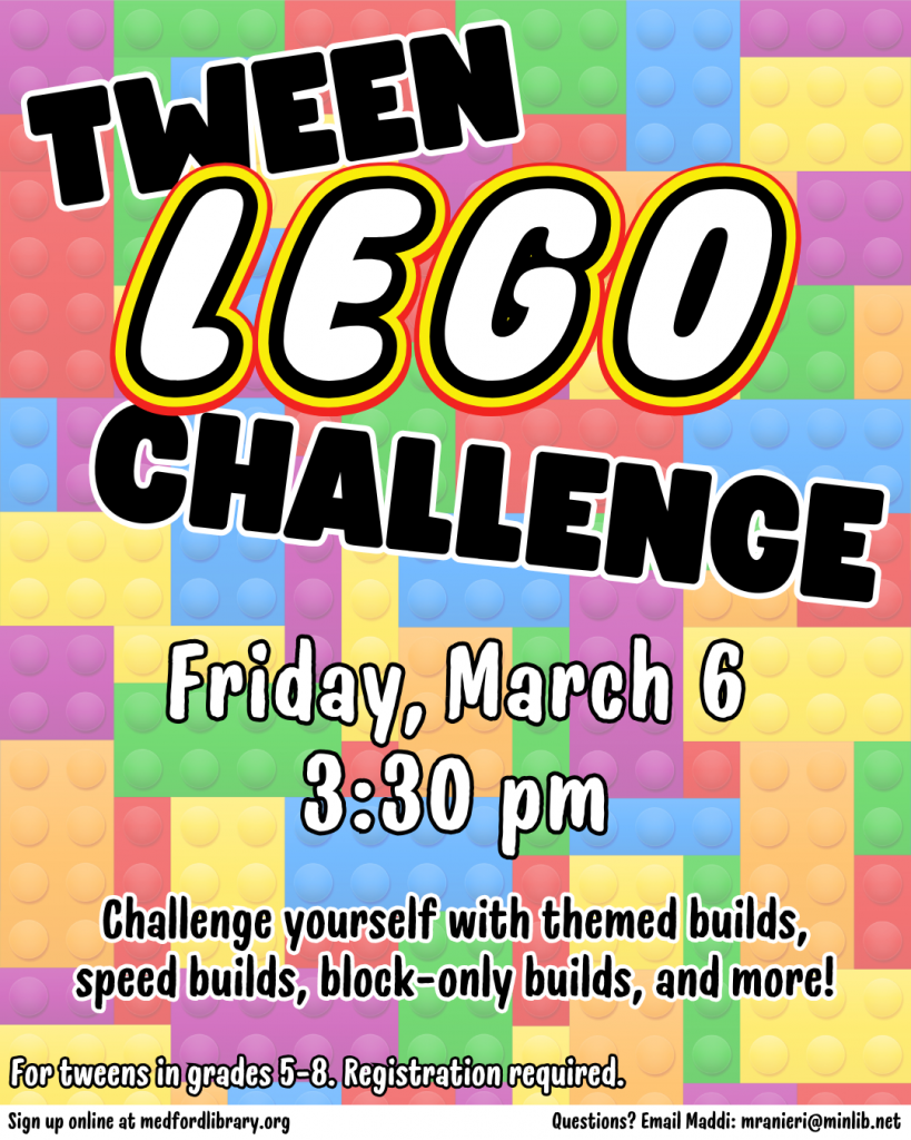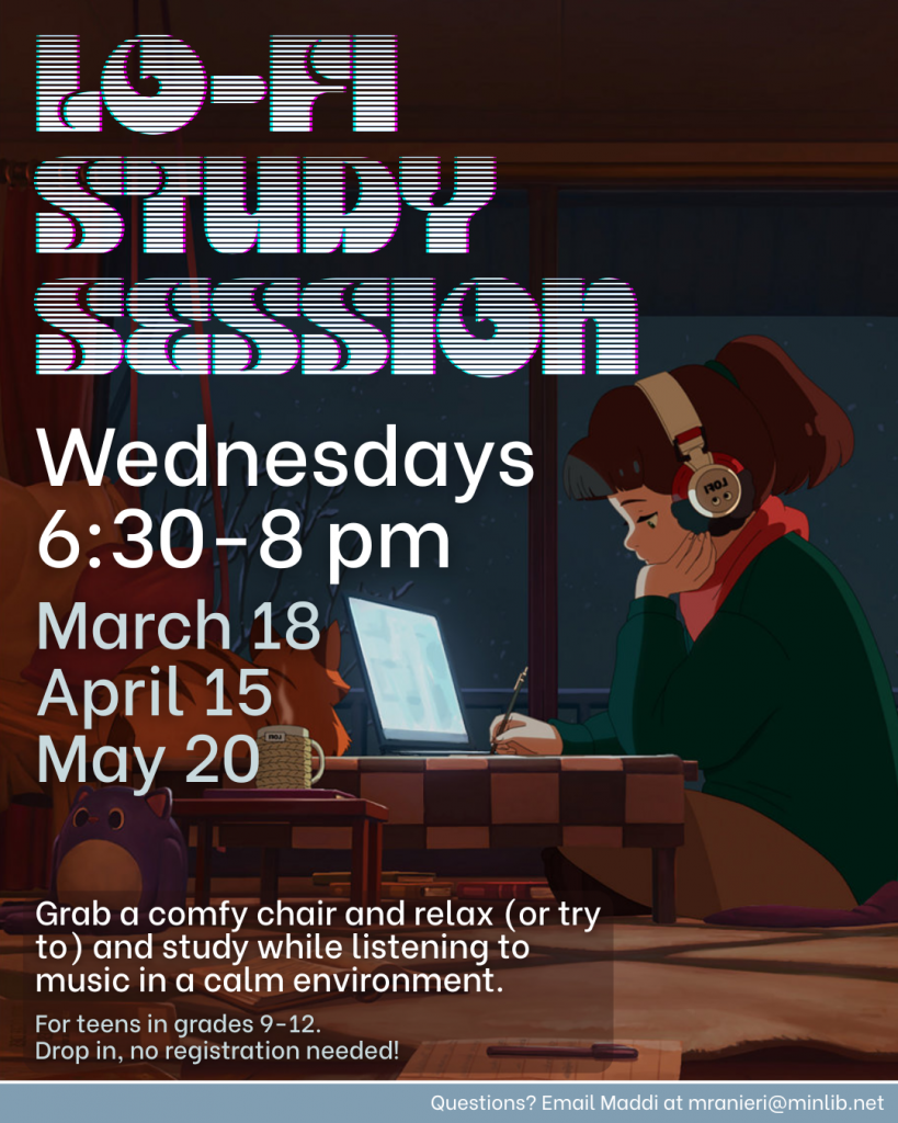 Teen Events We have a new sign up system! Registering for a program does not guarantee that you are officially signed up. Once library staff reviews your registration, you will get an email confirmation or an email letting you know that you are on the waitlist. Special Events February 6: Sign up February 14: No sign up needed February 17: Sign up February 18: Sign up February 20: Sign up March 5: Sign up March 10: Sign up encouraged Book Clubs: 2026 Teen Reading ChallengeJanuary 1- May 31 February 26: No sign up needed February 11: Sign up February 24: Sign Up February 27: Sign Up March 24: Sign Up Encouraged Monthly Programs February 9: No sign up needed February 10: Sign up February 11: Sign up February 13: No sign up needed! February 19: Sign Up February 23: No sign up needed! March 3: Sign up March 3: Sign up March 10: Sign Up March 18: No sign up needed! S.T.E.A.M. Programs February 9: Sign up February 18: Sign up February 9: Sign up February 26: Sign up March 2: Sign up March 6: Sign up March 19: Sign up March 26: Sign up If you have any questions, please contact Nicole in the Teen Section: nperrault@minlib.net | 781-475-5735