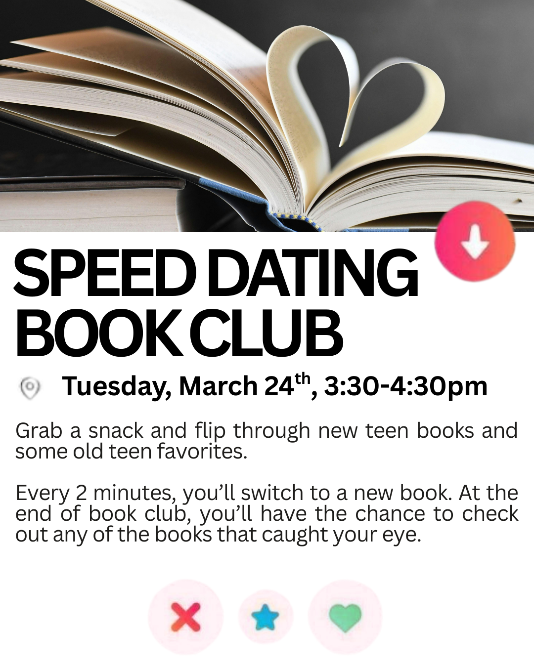Speed Dating Book Club is a drop in book club for teens. It typically meets every other month in Bonsignore Hall on the third Tuesday of the month. We set up all the newest teen books for you to flip through, along with some older teen favorites that might not have been on your radar when they first were released. Sign up is encouraged, but not required! For teens in grades 6-12.