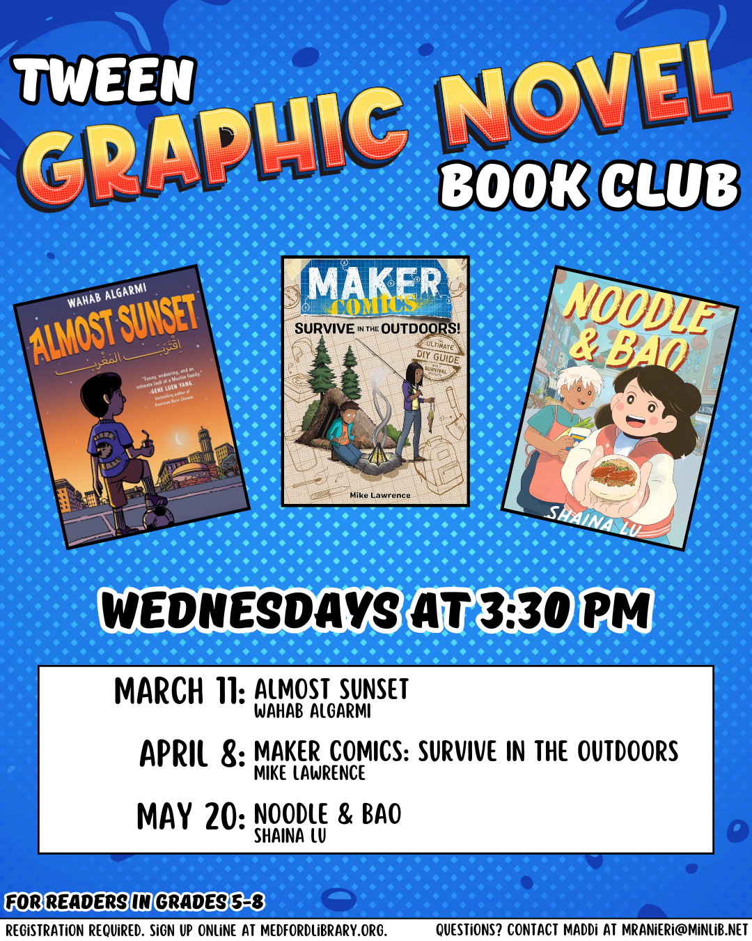 Our Tween Graphic Novel Book Club typically meets on the second Wednesday of the month to discuss all things graphic novels, with a focus on one in particular. You can pickup a copy of each month’s book in the Teen Section! Sign up required. For readers in grades 5-8.